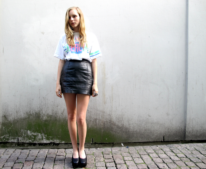 T-SHIRT: SECOND HAND, LEATHER SKIRT: SECOND HAND, SHOES: EXCLUSIVE SURI BY NELLY, RINGS: UGA BUGA AND ANTIQUE